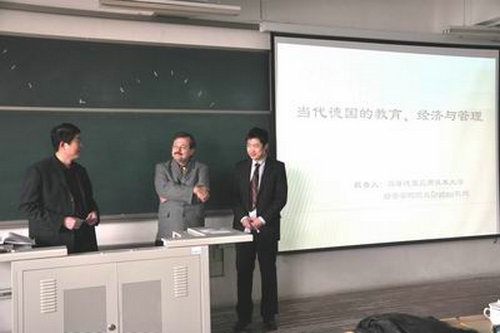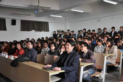 双方在管理学院资料室做了简短的会谈,就学校和学院概况、学生培养、合作办学等方面交换了意见。之后,Grabau教授为我院师生做了题为“当代德国教育、经济与管理”的报告。Grabau教授以马格德堡应用科技大学为例,对德国的文化教育体系做了详细介绍。马格德堡应用科技大学坐落在德国中部,拥有20余年办学历史,全校拥有6500多名学生。学校由马格德堡主校区和数个分校区组成,主校区以技术学科如机械制造、电子和媒体学等学科为主,分校区则以经济学、节能科学等学科为主。学校教学模式先进,采用三个月学习、三个月到公司实习的轮换式教学模式和远程教育教学等。同时,学校十分注意学生实践能力的培养,不仅在课程设置上突出实践环节,而且还要求学生必须有三个月以上、最好是在非德语的国家的海外实习经历。Grabau教授还向大家展示了马格德堡应用技术大学的校园风景。