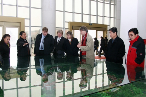 会见中,双方与会人员就建筑学、物流等专业学科、人员各方面的交流合作进行了会谈,并互赠礼品。会后,施莱伯博士一行在校领导的陪同下参观了校区沙盘。