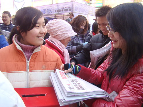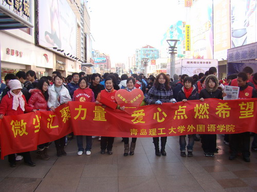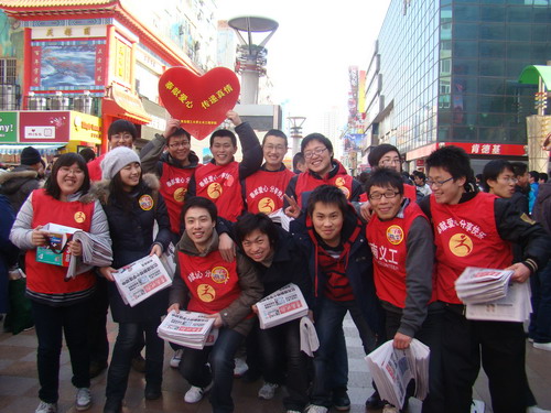 活动在台东三路步行街及沃尔玛超市附近举行。同学们扛着自己学校爱心基金会鲜红的会旗,手里拿着红色爱心标志,与其他志愿者和晚报记者一起,顶着寒风,走上街头,弘扬微尘精神,奉献炽热爱心。虽然天冷风寒,但经过大家一天的努力和广大市民的热情支持,活动最后圆满成功,七千份晚报一卖而光,365完美志愿者义卖数量勇夺第一。