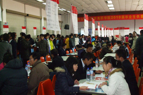 日前,高职学院2010届毕业生供需见面会在东校区举行。本次招聘会共有四十家用人单位应邀参加,提供了建筑、造价、物业、会计、装饰装潢、电子科技等近400个用人岗位。院领导亲临招聘会现场,深入了解用人单位的用人需求,征求用人单位的意见和建议。各相关部门负责人和毕业班辅导员也参加了本次招聘会,积极向用人单位介绍和推荐毕业生,关切地询问学生求职状况,给学生进行现场指导。