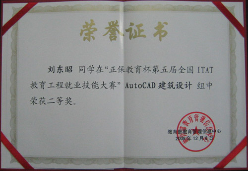 日前,正保教育杯第五届全国ITAT教育工程就业技能大赛在北京落下帷幕,在学校教务处和建筑学院的组织下,建筑学院景观建筑设计专业061班刘东昭同学顺利通过了预赛和复赛,成功进入北京决赛,在12月6号的决赛中获得AutoCAD建筑设计组二等奖。