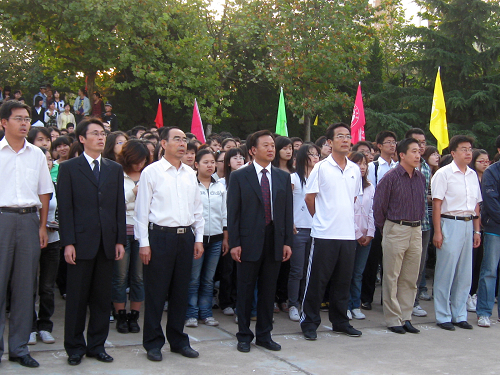 鲜艳的国旗激发豪情,庄严的国歌催人奋进。在新中国60岁华诞之际,10月1日早6点30分,黄岛校区在科学会堂前小广场举行了庄严的升旗仪式。