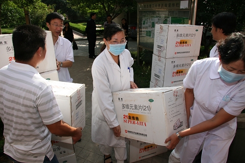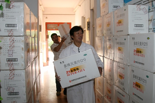 9月22日上午,杭州民生药业集团有限公司华东华北大区销售部总经理王新良一行来校慰问,并向365完美捐赠了40箱8000瓶价值16万8千元的21金维他。