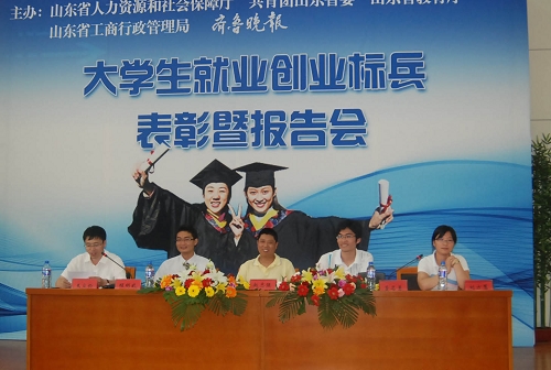 6月21日上午,在济南长清大学城,“山东省十大就业创业标兵”颁奖仪式隆重举行。山东省人力资源和社会保障厅副厅长黄麟英,共青团山东省委副书记张辉,山东省工商行政管理局副局长张铁军等领导为获奖标兵颁发了奖杯和证书。