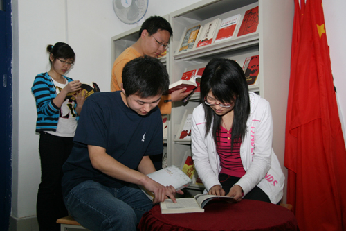 2009年是“五四运动”90周年和新中国成立60周年,由学生处主办、外国语学院承办、青岛新华书店有限责任公司四方书城协办的“读红色书,做志远人”读书征文比赛活动于5月12日拉开帷幕,四方书城免费为活动提供的百余本“红色书籍”当日摆满三味书屋。