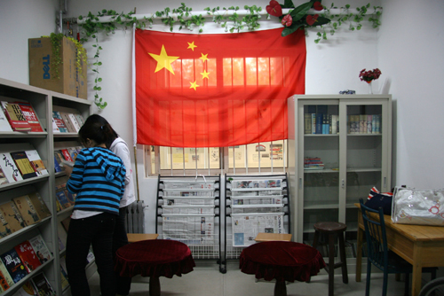 红色的国旗在阳光下格外鲜艳,《共和国记忆60年成长地标》、《伟大的历程——中国改革开放30年》等“红色书籍”一排排整齐地摆放在书架上,几名同学在红色的国旗下静静地阅读——位于北院学生2公寓一楼的“三味书屋”,近日变成了“红色的海洋”,成为大学生爱国主义教育的生动课堂。