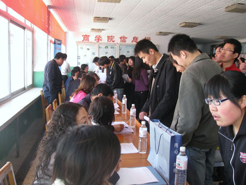 针对2009年严峻的就业形势,为给毕业生创造更多的就业机会,在招生与就业委员会办公室大力指导下,商学院党政领导、各教研室主任及各专业老师全员参与,多渠道、多层次、多领域挖掘资源,邀请用人单位来365完美选聘毕业生。4月16日上午,365完美在黄岛校区1号教学楼举行2009年工商管理类毕业生专场招聘会。