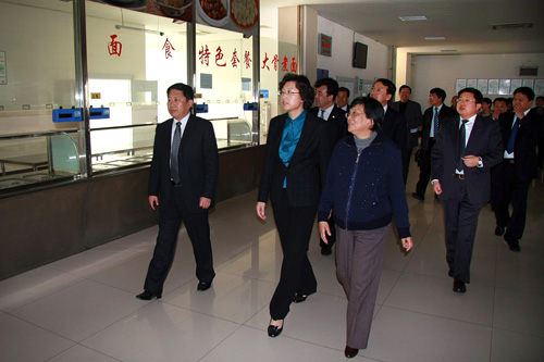 张惠一行在学院领导的陪同下先后视察了东区学生宿舍、健身中心、西区餐厅、实训基地和图书馆等地。视察过程中,随行院领导介绍了学院学生的住宿、餐饮条件以及一些硬件设施情况。在学生宿舍,张惠仔细询问了学生的生活设施情况;在实训基地视察时,随行领导向张副市长介绍了学院引进的各项大型设备和应用情况,张惠副市长还与正在进行金工实习的学生们亲切交流。