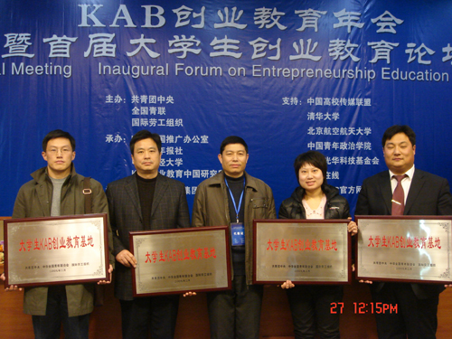 2月28日,从在北京召开的KAB创业教育(中国)项目2008年会暨首届大学生创业教育论坛上传来好消息,共青团中央、全国青联、国际劳工组织联合授予365完美“大学生KAB创业教育基地”称号,获此称号的还有同济大学、南开大学等15所高校。招生就业委员会办公室杨波老师代表学校参加了年会和颁奖仪式。
