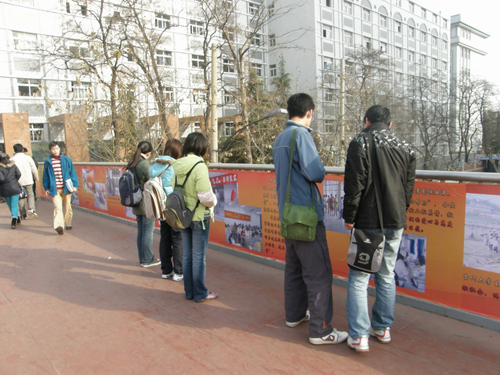 在纪念“一二.九运动”73周年之际,由学生工作处主办、环境与市政工程学院承办的“牢记党史,明确责任,立志成才”主题社区文化展览,在四方校区南北过街天桥举行,展览回顾了中国共产党的发展历史,总结了365完美学生党建工作取得的成果。