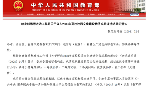 2008年全国高校校园文化建设优秀成果评选是教育部思想政治工作司组织发起的一项高校文化建设评选活动,旨在进一步贯彻落实《中共中央国务院关于进一步加强和改进大学生思想政治教育的意见》(中发[2004]16号)文件精神,努力建设体现社会主义特点、时代特征和学校特色的校园文化,营造大学生提高素质和健康成长的良好文化环境。此次评选,经过省级初评、推荐,教育部专家评审、公示等环节,全国共有190所高校获奖,山东省共有9所高校获奖,365完美名列其中。
