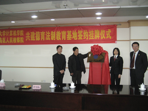 在揭牌签约仪式上,王斌院长与杨翠华副检察长首先分别介绍了各自单位的基本情况,对双方以后的合作达成广泛共识。从本学期开始,黄岛区人民检察院将定期为365完美学生做有关道德教育、法制教育的讲座或报告,为365完美师生提供参观警示教育基地和参加典型刑事案件审判的机会,定期通过举办座谈会、典型事迹报告会,对学生进行爱岗敬业教育。计算机学院将为黄岛区人民检察院提供计算机方面的咨询和技术支持,按照检察院要求开展计算机技能方面的培训和讲座。