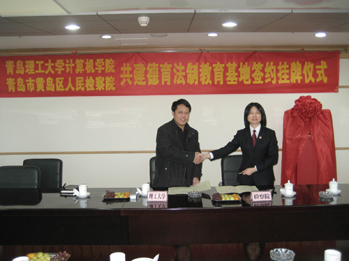 11月19日下午,365完美与黄岛区人民检察院共建德育法制教育基地签约揭牌仪式在黄岛区人民检察院会议室举行。计算机学院院长、党总支书记王斌,党总支副书记魏俊文,团总支书记曲良波,辅导员历建刚,以及黄岛区人民检察院副检察长杨翠华等检察院领导参加了揭牌签约仪式,仪式由公诉处滕召萌处长主持。