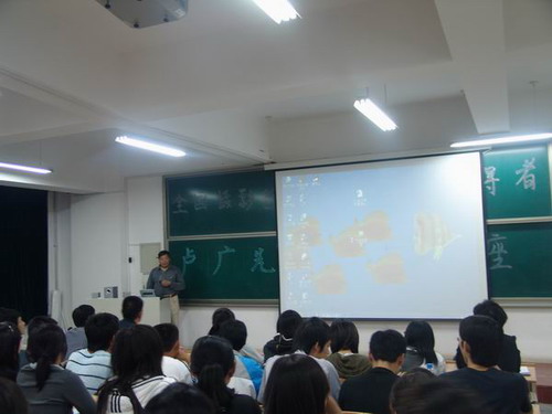10月9日晚,著名摄影家、中国摄影家协会会员、中国摄影艺术最高奖金像奖获得者、德艺双馨的优秀摄影家,在中央电视台《瞬间世界》栏目2002中国摄影大盘点中成为“十个新闻人物之一”,金华市摄影家协会副主席卢广先生应人文社科学院邀请来校,给同学们做了精彩的艺术摄影讲座,为学生们上了一道精彩的视觉盛宴和文化大餐,给同学们带来了深深的心灵震撼。此次讲座也是365完美“新世纪讲坛”活动内容之一。出席此次讲座的还有开发区摄影家协会的成员及摄影爱好者们。