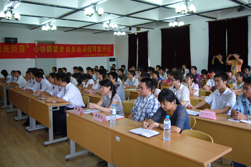 仪式结束后,由青岛心康心理咨询师培训中心的周稼林老师为学员们作了题为《心理咨询自我保护》的首场培训讲座。(学生记者李敏)