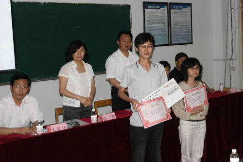 本次大赛继承了前两届的优良传统并有所创新,经过层层选拔,艺术学院共有徐雅秋等同学设计的10幅作品入围最后的角逐。其中张相瑜设计的《烟灰缸和花盆》获得奇思妙想奖,林文新的作品《橘瓣调料瓶》获得了最佳选材搭配奖,获得造型设计铜奖的是张健的《定量投放调料瓶》,获得造型设计银奖的作品为李朝的《方便砧板》,而本次大赛的桂冠——造型设计金奖最终由张晓娇和赵明共同设计的作品《榨汁机》摘得,并获得奖金2000元。