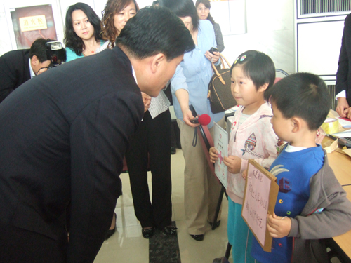 在市红十字会,小朋友们见到了正在红十字会视察的夏耕市长。当夏市长亲切的询问孩子们关于捐款的事情时,邸相凯小朋友说:“我在电视里看到,四川发生地震,学校和幼儿园都倒塌了,灾区的小朋友们没法上学了,我们把零花钱捐给灾区,希望灾区的小朋友们重建家园,再回到幼儿园上学,过上和我们一样的幸福生活!”