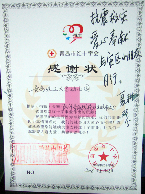 夏耕市长对小朋友们的爱心表示赞赏和感动,欣然为小朋友们题词:“抗震救灾 爱心奉献 与灾区小朋友同行。”
