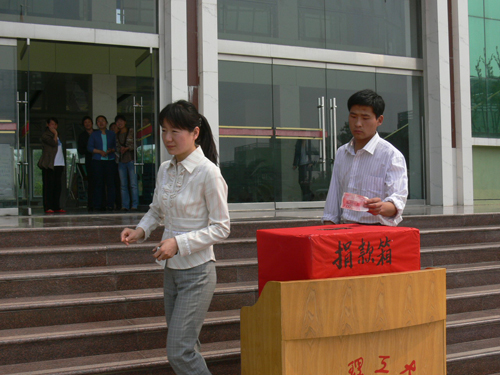 地震无情人有情,一方有难八方援。5月15日上午,校区领导张伟星、朱卫东、阚凤才带头向四川地震灾区捐款,全体教职员工和学生踊跃参加,短短半个小时,就收到师生捐款23719.70元。