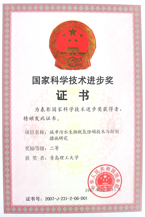 张波教授、毕学军教授等人完成的《“城市污水生物脱氮除磷技术与控制措施研究”》获国家科技进步奖二等奖。