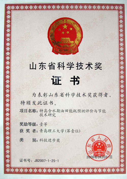 仪垂杰教授、周扬民和林海波讲师等人完成的“特高含水期油田能耗预测评价与节能技术研究”科研成果获山东省科技进步一等奖。