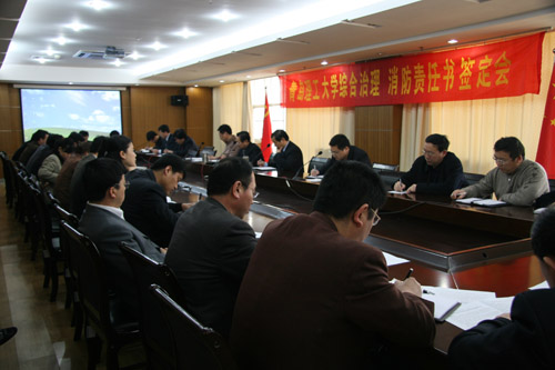 耿喜华书记与各学院(部)、职能部门负责人签订综合治理暨消防责任书,校办副主任孙川三宣读《关于表彰2007年度综合治理先进单位和先进个人的通报》,教务处、黄岛校区办公室、机械学院、自动化学院负责人作综合治理典型经验交流。