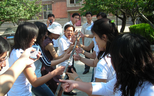 下午,全体联谊会代表在大学生活动中心前的广场进行了椅子渡河、趣味性拔河、“编花篮”等拓展性训练活动,在沟通互动中锻炼了创新和表达能力,增进了友谊。