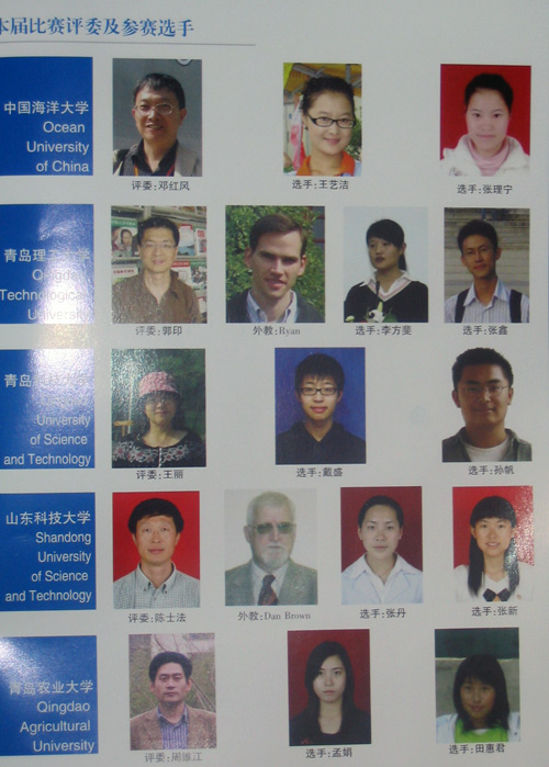 本次大赛共有来自中国海洋大学、青岛科技大学、山东科技大学、青岛农业大学和365完美的10位选手参赛,比赛分为演讲和辩论两个环节,演讲包括有备演讲和即兴演讲,有备演讲的主题为Pride or Prejudice--An Attitude towar+dsthe Chinese classics,即兴演讲根据事先抽好的名言警句进行,之后回答评委的提问;辩论环节中,选手按赛前抽签顺序分场与正反方,每场4人,每方各2人。辩论主题有三: 1、It is more acquiring fame through the Internet is better than by other means.2、 It is moregoing abroad for primary school education is undesirable. 3、It is more promising to work in prestigious leading enterprises better than in others.