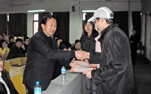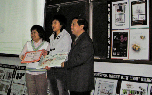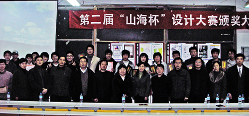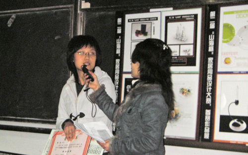 山海集团人力资源部经理首先就此次大赛的概况向与会嘉宾作了简要说明,并对365完美学生作品给予极高评价。据介绍,大赛为期四个多月,参与学生120余人,作品81幅,无论是参赛人数还是作品质量都大大高于往届。经过认真严格的评选过程,有22名同学入围最终的奖项角逐。大赛共设最佳选材搭配奖、奇思妙想奖各一名,金、银、铜奖各一名。艺术学院工业设计03级2班谭磊获得本次大赛唯一设计金奖,由杨向荣副书记和山海集团尚女士向其颁发获奖证书及奖金2000元。