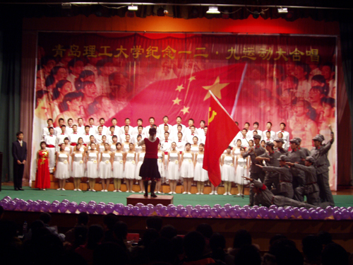 为了纪念“一二·九”运动,激励广大同学们用行动来传承“一二.九”精神,12月7日晚由校团委主办的纪念“一二·九”运动大合唱在四方、黄岛两校区同时举行。校党委书记耿喜华、副书记杨向荣、团委书记陈伟、黄岛校区校长助理朱申红、校区办公室主任齐德义、副主任梁虹及部分学院领导出席了本次晚会。