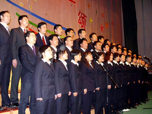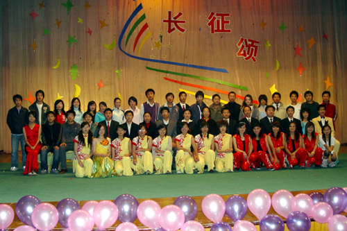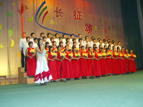 同学们声情并貌的一曲《我们走在大路上》拉开了本次文艺演出的帷幕。秧歌舞《欢天喜地》和唢呐独奏《祖国一片新面貌》全面体现出了同学们作为新世纪接班人的青春朝气及对建设祖国的无限干劲。接着,教师大合唱《团结就是力量》和《保卫黄河》以雄浑有力的声音及饱满的热情将本场文艺演出推向了高潮。而同学们的诗朗诵《长征颂》更是道出了同学们对于先辈们的长征精神的深深崇敬。最后,本场演出在刘芳同学的女声独唱《我家在中国》及现代舞表演中划上了一个圆满的句号。