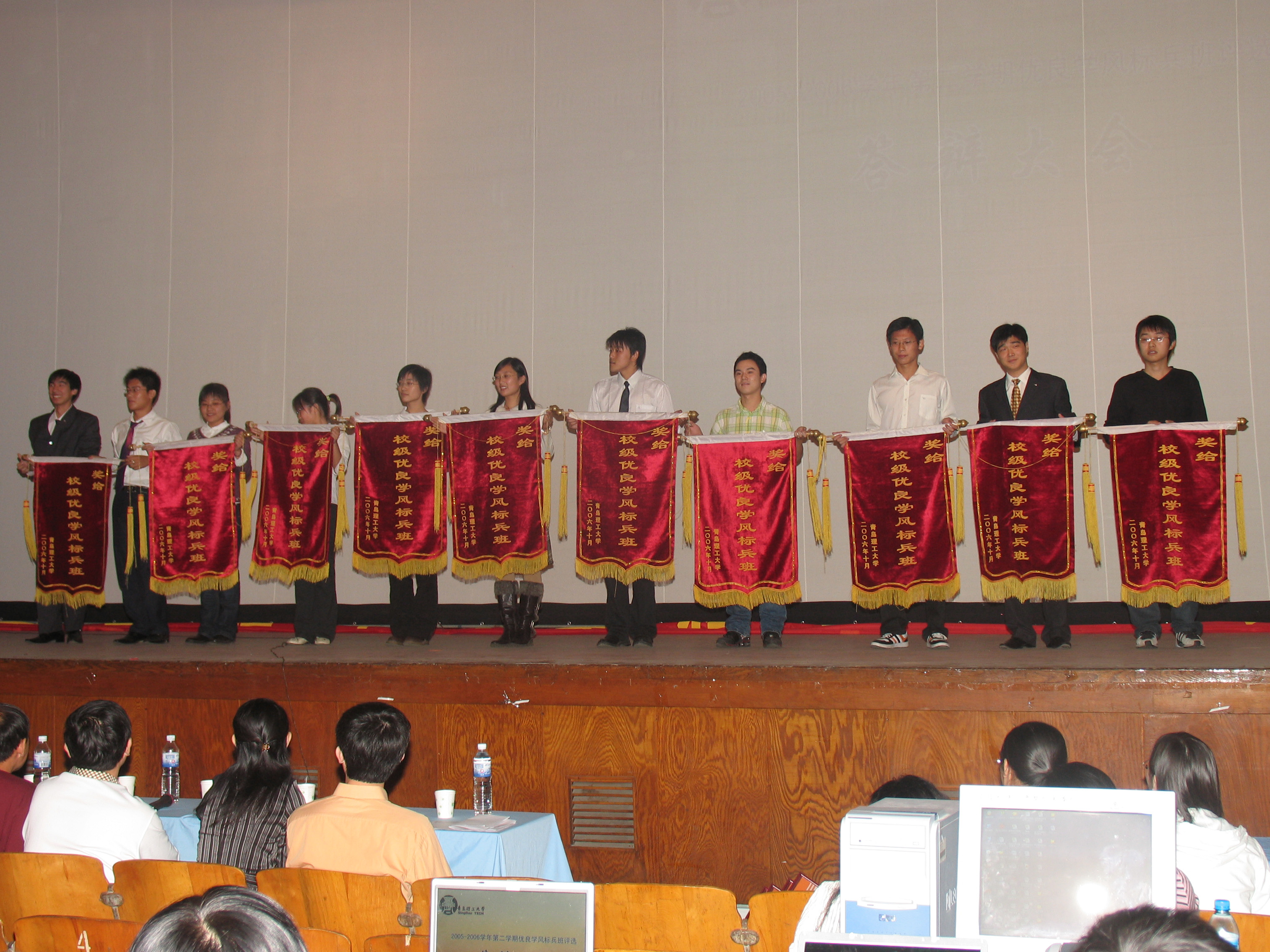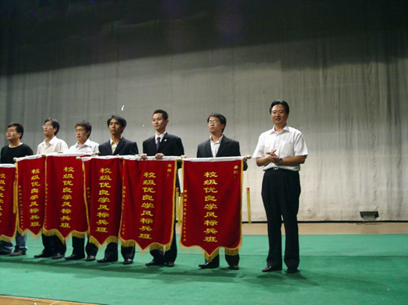 校党委副书记杨向荣、副校长李东为获得“优良学风标兵班”的班级颁发锦旗,校长助理朱申红、学生处副处长沈文青、教务处副处长赵金先、马洪洲、校团委副书记乔海涛为“学习优胜班”班级颁发证书。