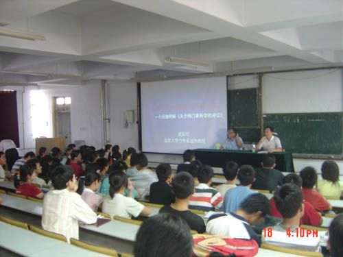 报告中,武教授介绍了伽利略的两本不朽的著作:《关于托勒密和哥白尼两大世界体系的对话》(1632年版),这本书全面系统地讨论了哥白尼日心体系和托勒密地心体系的各种分歧,并以作者许多新的研究成果和新阐释的惯性原理,揭示了哥白尼体系的正确和托勒密体系的谬误;《关于两门新学科的对话》(1638年版),武教授对其中的精彩片断向同学们作了介绍。
