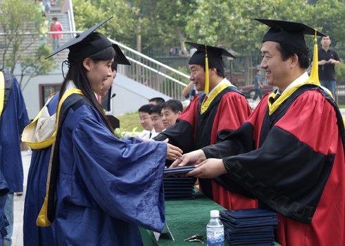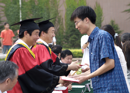 在催人奋进的《毕业歌》声中,校党委书记耿喜华、校长仪垂杰为全体毕业生逐一授予学位并颁发了学位证书。(杨延生)