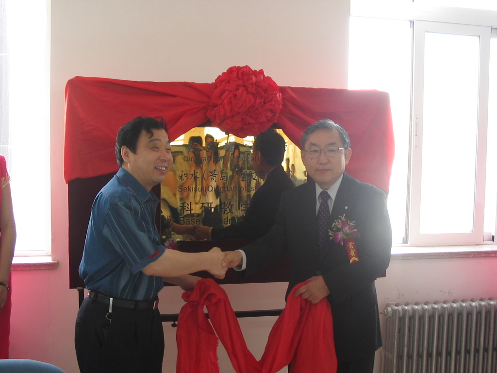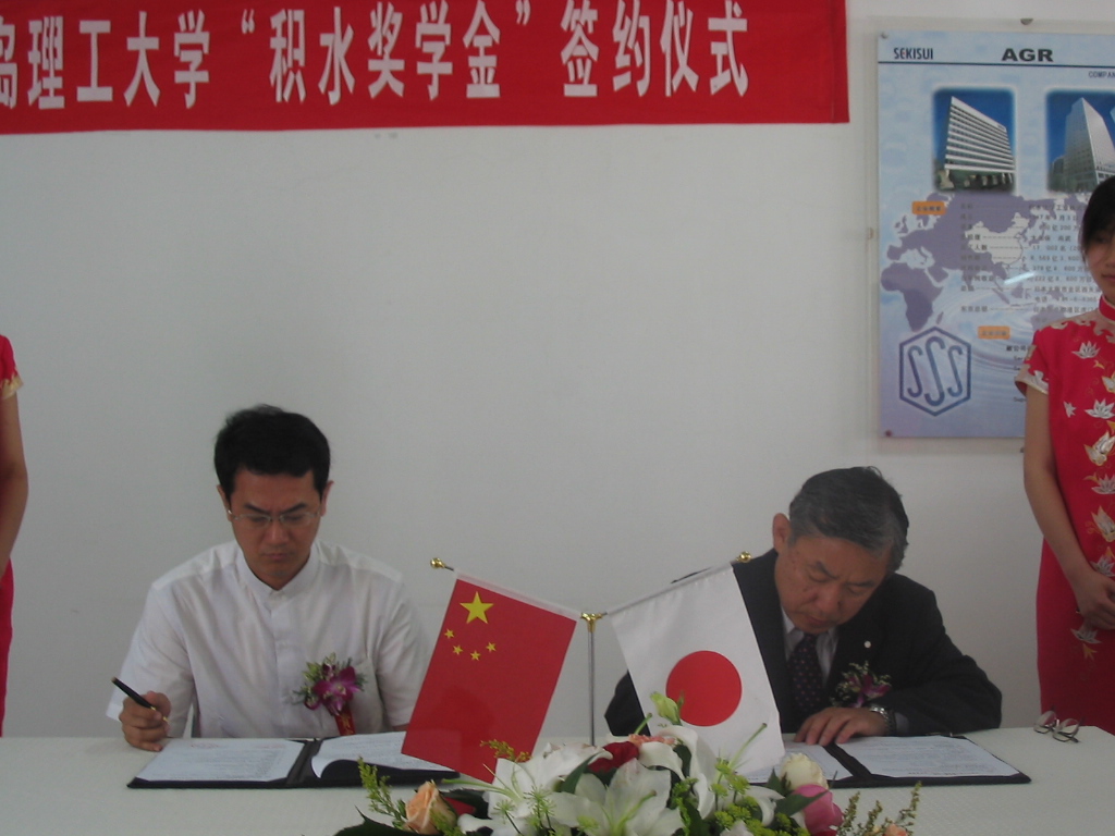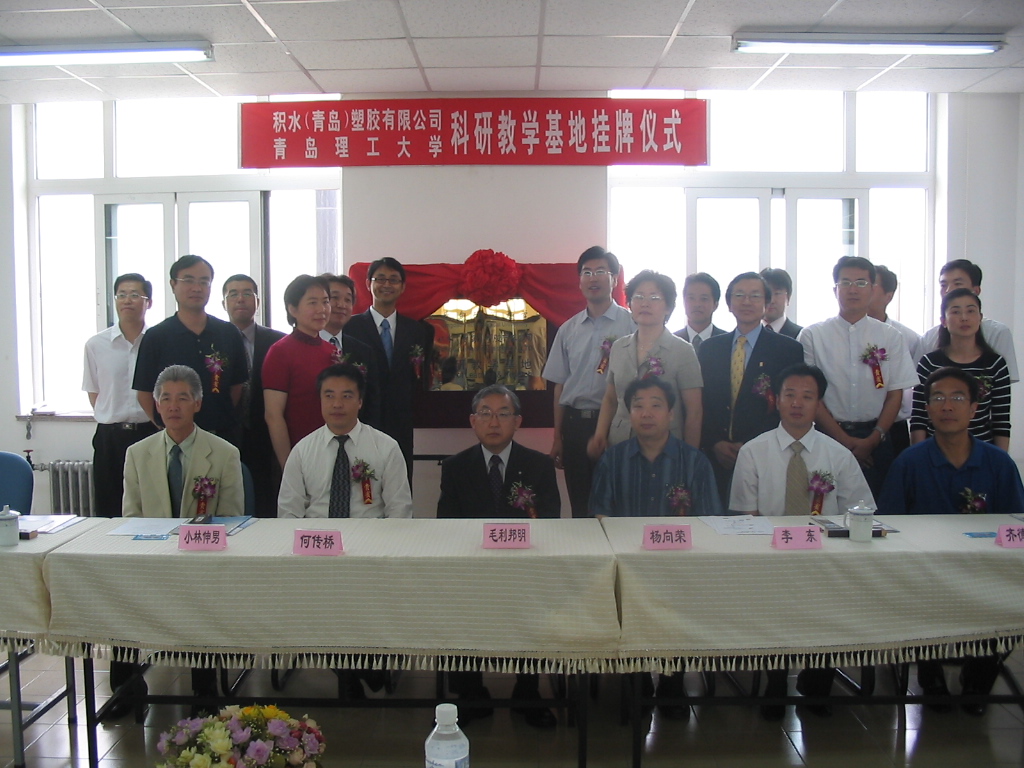 仪式上,杨向荣副书记与积水(青岛)塑胶有限公司董事长毛利邦明先生为科研教学基地揭牌;环境学院院长吕谋与毛利先生在协议书上签字;李东副校长和积水(青岛)塑胶有限公司毛利先生分别代表校企双方讲话。