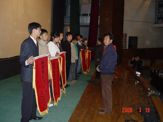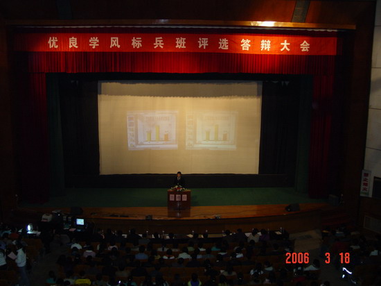 本次答辩大会共有 22个班级参加,通过课件展示和现场答辩相结合的形式进行,历时4小时。学生处副处长沈文青以及教务处副处长赵金先分别宣读获奖班级名单。共评选出36个“学习优胜班”、70个“优良学风班”。经过激烈角逐,03广告2班、03经贸4班、04国工3班、04商学院4班、05商学院3班、05商学院11班、05电气2班、05交通2班、05国贸1班和05贸升1班等十个班级获得“优良学风标兵班”称号.副校长赵铁军、副校长李东为获奖班级所在学院的党总支副书记颁发证书,并为获得“优良学风标兵班”的班级颁发锦旗。