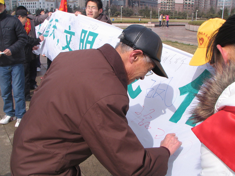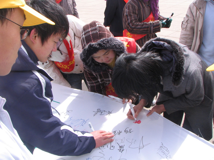 上午10时许,共青团中央书记处书记贺军科、团省委书记陈伟、团市委书记张惠一行视察活动现场,对活动给予充分肯定,感谢同学们对奥运工作的支持和志愿服务社会的热情,鼓励大家再接再厉。几位书记在横幅上签下了自己的姓名并与同学们合影留念。在活动的两个小时中,寒风凛冽,同学们不畏寒冷,坚守在各自岗位上,最终保证了活动的圆满成功。活动签名横幅和相关调查信息将于近期交付青岛奥帆委。