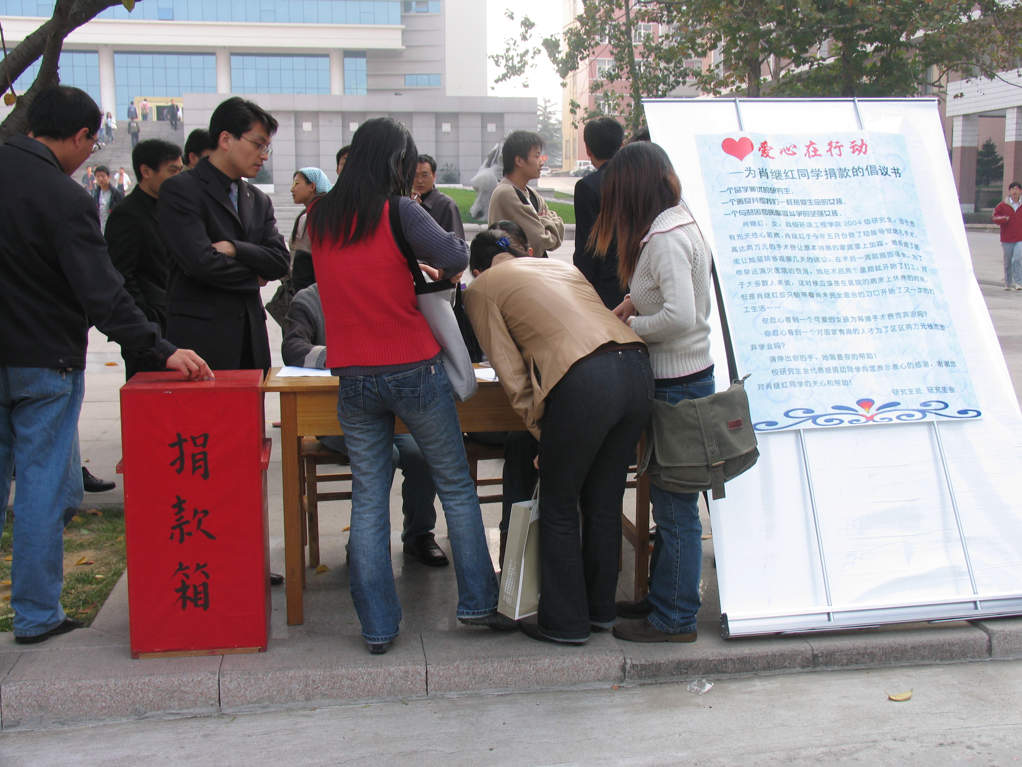 11月2日,研究处发出倡议,号召大家为2004级研究生肖继红同学捐款,奉献自己的一份爱心。研究处的老师及同学纷纷来到募捐箱前, 10元、50元、100元……大家捐献的数额不等,但点点滴滴都凝聚着全体师生的爱心和关心,凝聚着对肖继红同学的深深祝福和殷殷期冀。