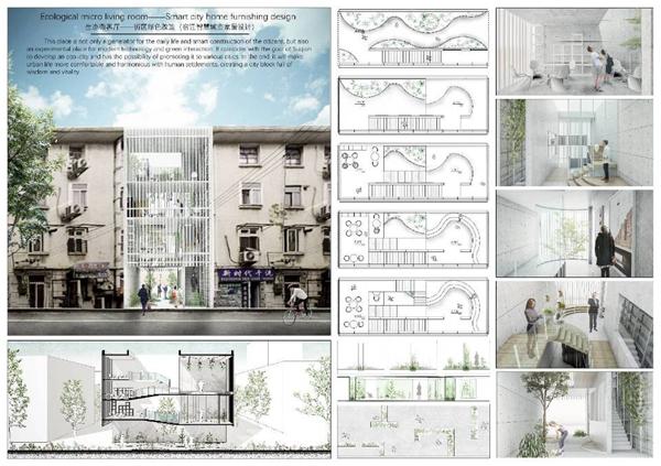 365完美参赛作品《生态微客厅——街区绿色改造(宿迁智慧城市家居设计)》选址在宿迁市街区中的街道微空间,旨在为此空间营造人们与自然亲密接触的生态家居场所,将阳光、空气和绿色引入其中,吸引人们在此驻足休憩,共同营造和享受绿色健康的生活方式。横向的板片、条状的格栅、交互的楼梯以及穿插的庭院共同构成了丰富的空间体验,将居民和来往行人的行为方式容纳其中。所有的构件元素以最为简洁纯净的方式融于街道立面,一旦涉足却别有洞天。在此空间中,遛鸟的老人、路过的上班族、嬉闹的孩童以及传承古法的老手艺人,将宿迁的生活与文化浓缩于方寸之中,城市温度尽显。