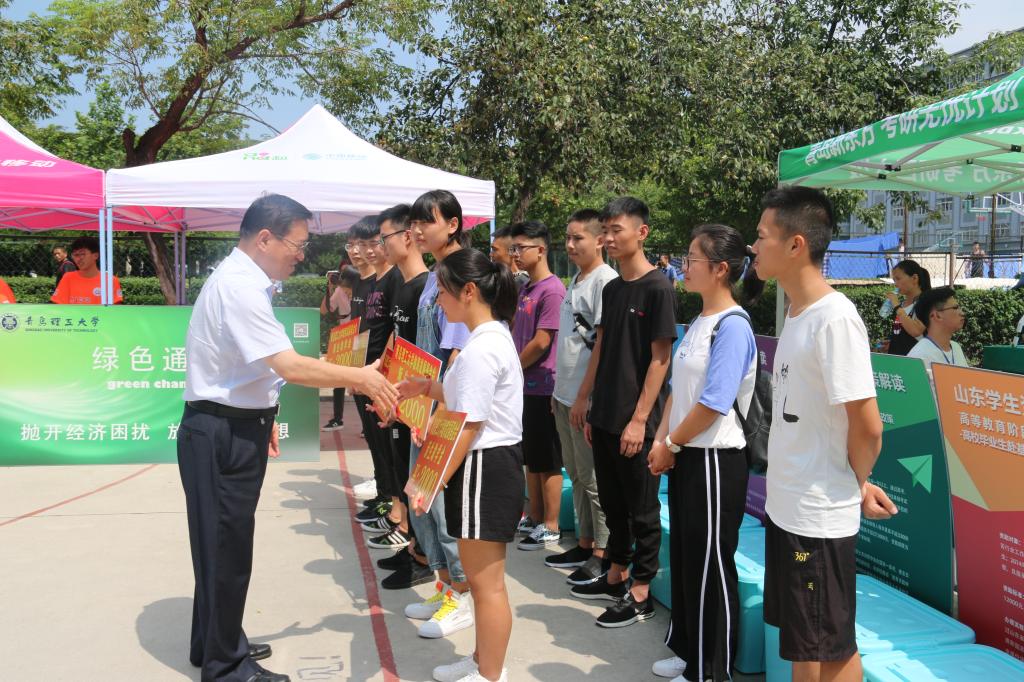 上午,校长谭秀森,校党委副书记张殿恒,副校长李国华、张伟星、齐德义在相关部门负责人陪同下,分别深入市北、黄岛、临沂校区迎新现场,看望前来报到的2018级新生,慰问参与迎新工作的师生员工。