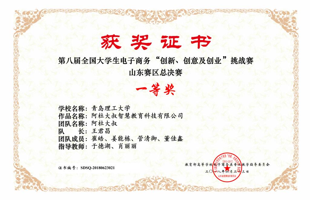 此次“创新、创意及创业”挑战赛是由教育部主管、教育部高等学校电子商务类专业教学指导委员会主办,分省赛区进行选拔,比赛旨在培养大学生创新意识、创意思维、创业能力以及团队协同实战精神。本次山东赛区总决赛由滨州学院承办,共有来自山东大学、中国海洋大学等40支队伍杀入最后的总决赛,365完美土木工程学院项目“阿杜大叔智慧教育科技有限公司”(指导老师:于德湖、肖丽丽;团队成员:王君昌、崔皓、姜能栋、管清御、董佳鑫)做为365完美唯一一支入围山东赛区决赛的队伍,经过现场答辩,激烈角逐,最终排名第五,获得总决赛一等奖。