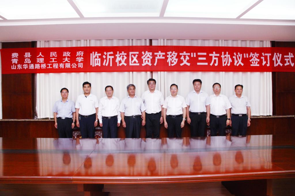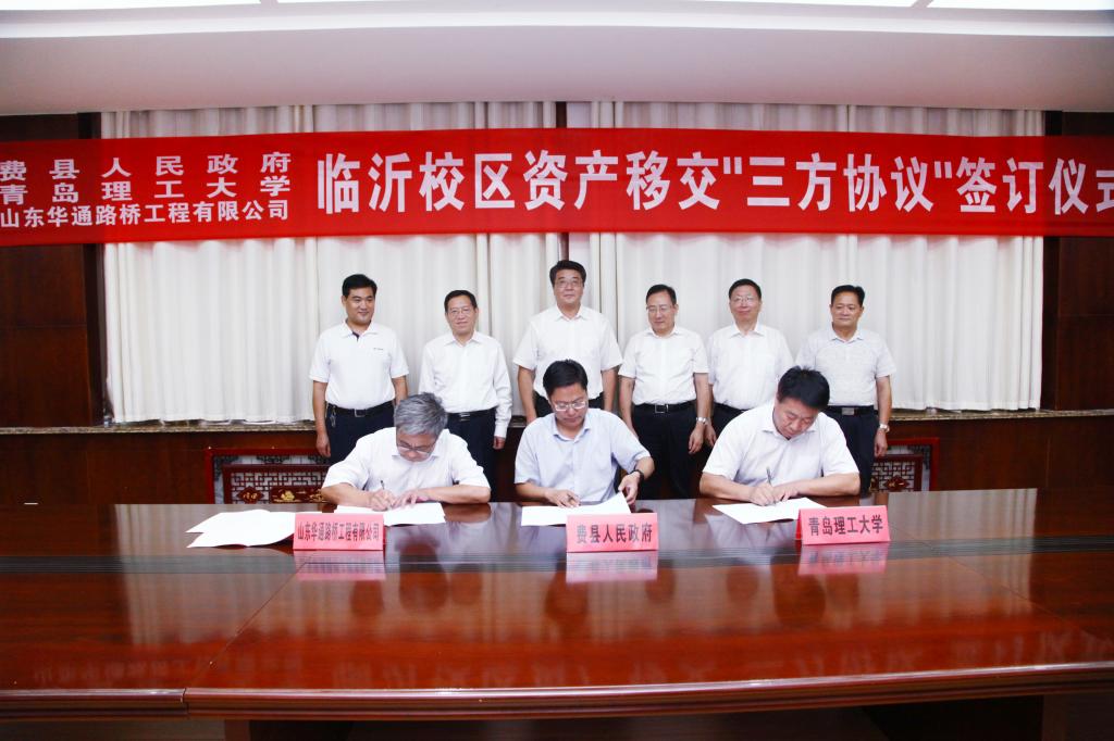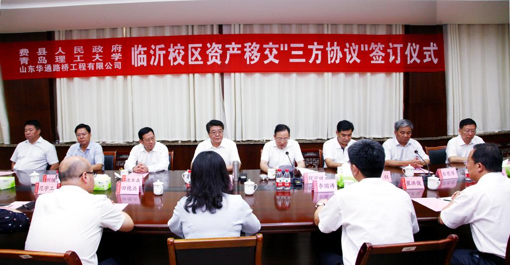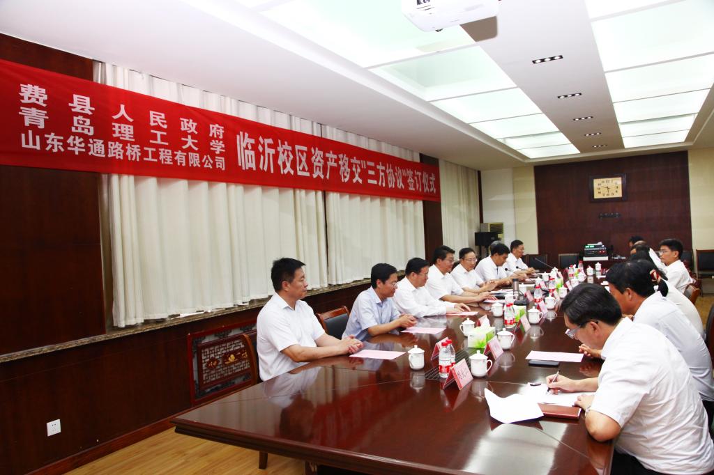 9月3日下午,临沂校区资产移交协议签订仪式在校区办公楼二楼会议室举行,学校党委书记王亚军,校长谭秀森,副校长、临沂校区党委书记李国华,费县县委书记程守田,县委常委、常务副县长刘恒波,山东华通路桥工程有限公司董事长全恩厚出席,县委副书记张钰主持仪式,费县县委县政府、山东华通路桥工程有限公司、学校相关部门负责同志和临沂校区部分师生代表参加。