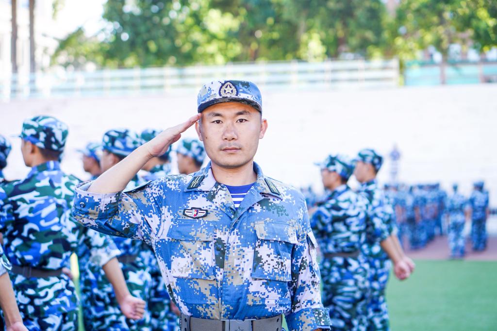 真要丢下“花架子”,在学生面前当好榜样,真不是一个轻松活。烈日炎炎,汗如雨下,要想让学生信服自己,自己首先就要咬牙坚持,动作就要标准。打开微信运动,新生辅导员最近一周都在“霸屏”,平均每人每天步数都超过2万。“迎新时,学生都叫我‘超哥’,这不军训完了,大家都改叫‘黑哥’了”-信息与控制工程学院新生辅导员王超感叹道。“来的最早、走的最晚、标准看我”,虽然很辛苦,但是工作的效果也是很明显,学生请假“躲训”的少了,咬住牙坚持的多了;吐槽发牢骚抱怨的少了,愿意和老师聊聊心里话的多了。学生的训练积极性和集体荣誉感都被调动起来了,师生同心同德奋勇争先成为军训场上一道亮丽的风景线。