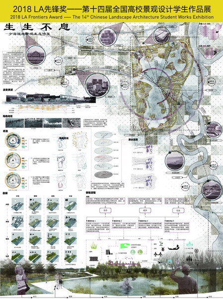 由刘森、齐飞、张一平老师指导,风景园林专业本科四年级学生于汶藜、钟晓鸣、张梦娇、杨霄霞四位同学提交的作品《生生不息—少海湿地景观生态修复》荣获景观设计类综合奖。获奖作品针对青岛市胶州地区的水患现状提出修复性解决方案,就地取材,以芦苇编织物和淤泥修建生态坝,引流污水冲刷出小型湿地及浮岛,建立起陆地-生态坝-湿地-浮岛多级引流净化系统以增加场地的生物多样性,恢复湿地的生态循环。湿地内进行河蚌养殖,净化水质,发展珍珠业和生态旅游,与芦苇编织业共同带来经济收益和工作岗位,解决渔民收入问题,建立起生态-经济-社会的良性循环。