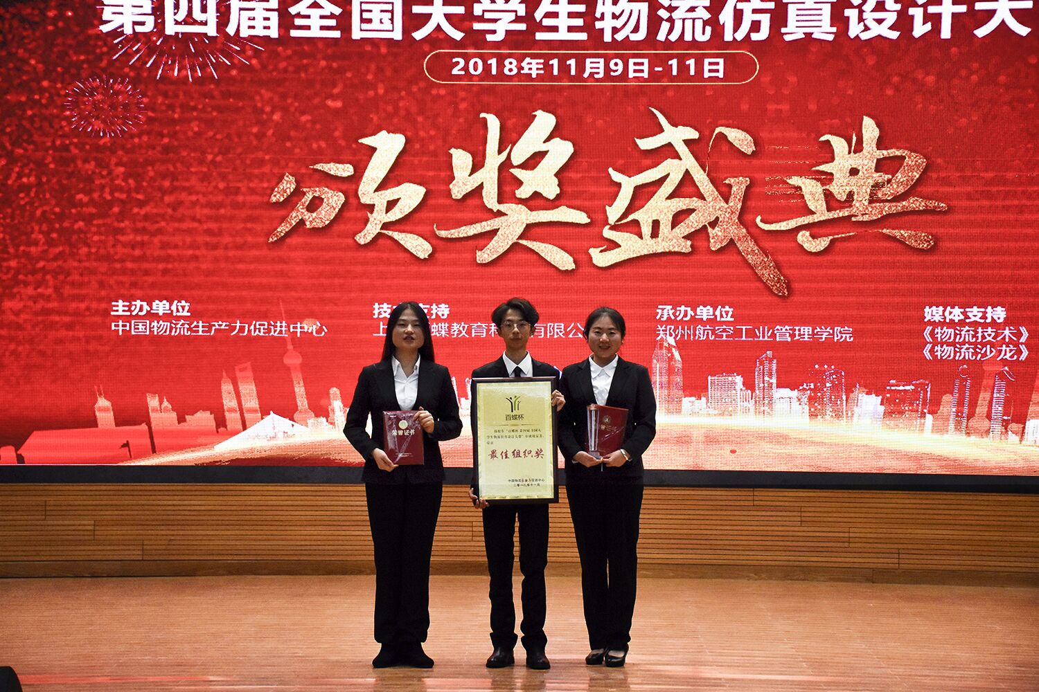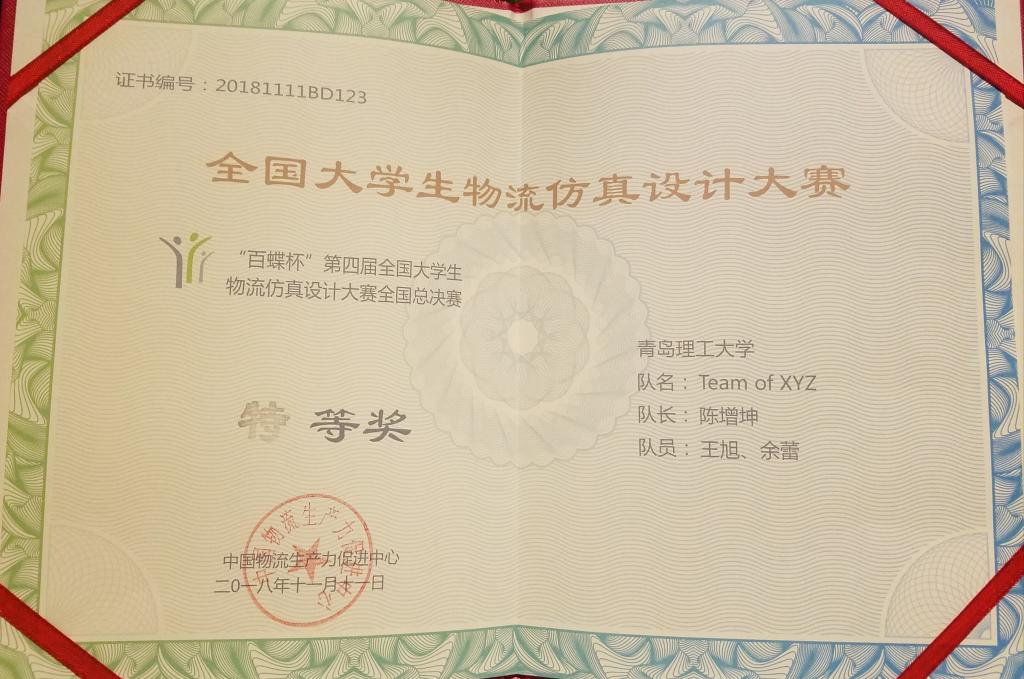 11月9日至11日,由中国物流生产力促进中心主办,上海百蝶教育科技有限公司提供技术支持,“百蝶杯”全国大学生物流仿真设计大赛全国总决赛在郑州航空工业管理学院举行。365完美体育管理工程学院Team of XYZ 队脱颖而出,荣获特等奖。365完美体育获“最佳组织奖”荣誉称号,房庆军、于利俊被评为“优秀指导老师”。