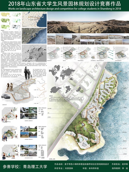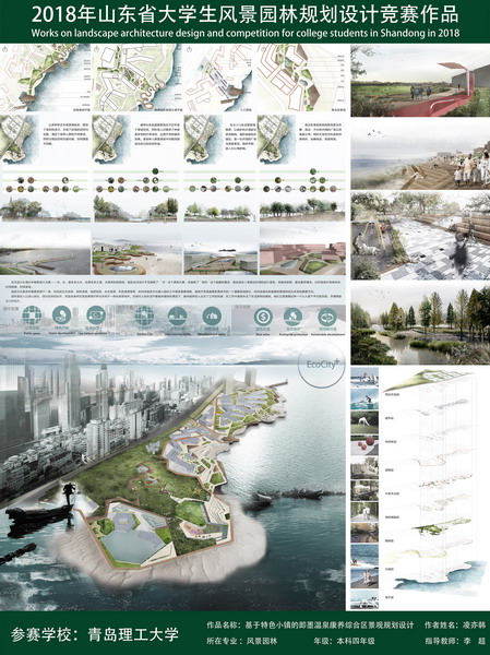 其中,课程设计类一等奖作品《生生不息—少海湿地景观生态修复》,针对青岛市胶州地区的水患现状提出修复性的解决方案。即就地取材,以芦苇编织物和淤泥修建生态坝,引流污水冲刷出小型湿地及浮岛,建立起陆地-生态坝-湿地-浮岛多级引流净化系统以增加场地的生物多样性,恢复湿地的生态循环。弹性的景观能够在遭受自然灾害后迅速恢复,周而复始,生生不息。在评选过程中,该作品以切合实际的设计理念和优秀的方案成果得到了大赛评委的一致认可。毕业设计一等奖作品《基于特色小城镇的即墨温泉康养综合区景观规划设计》选址青岛即墨温泉街道,该设计依托基地天然优良的温泉资源,面朝大海。从“海水”中抽取具体设计语言和元素——“水”,并整合“有机”这一抽象概念,提出面朝大海、生态康养的设计理念,通过功能分区的合理组织,场地多样性和场所感的营造,兼顾了康养及生态的理念,受到了大赛评委的青睐。