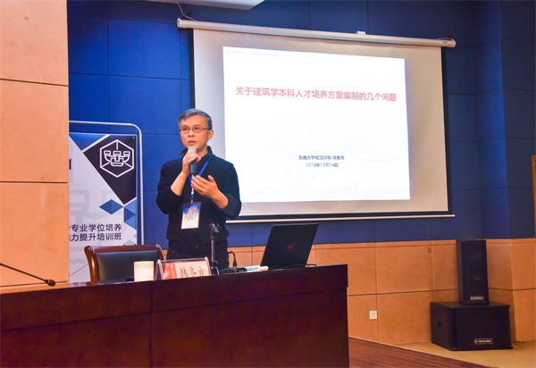 教育部高等学校建筑类专业教学指导委员会秘书长、中国建筑学会建筑教育评估分会理事、东南大学建筑学院院长韩冬青教授作了题为《关于建筑学本科人才培养方案编制的几个问题》的授课讲座,他在介绍到“培养目标与要求”这一模块时,特别强调了各高校应该根据建筑学培养目标和自身办学定位,结合各自专业基础和学科特色,以及所在地区的发展状况,培养适应国家和社会发展的多样化人才,并在最后与大家分享了东南大学的人才培养方案,希望能够给大家提供借鉴。