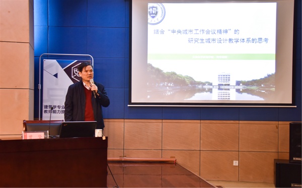 天津大学建筑学院曾坚教授进行了以《结合“中央城市工作会议精神”的研究生城市设计教学体系的思考》为题的授课讲座,他首先介绍了研究生城市设计教学体系基本内容,接着点到了中央城市工作会议与城市设计的基本概念,并强调了一个尊重、五个统筹的中央城市工作会议精神要点,指出各个高校无论是在本科生教学还是研究生教学过程中,都不能够离开这项会议精神,应该时刻保持进步与发展。