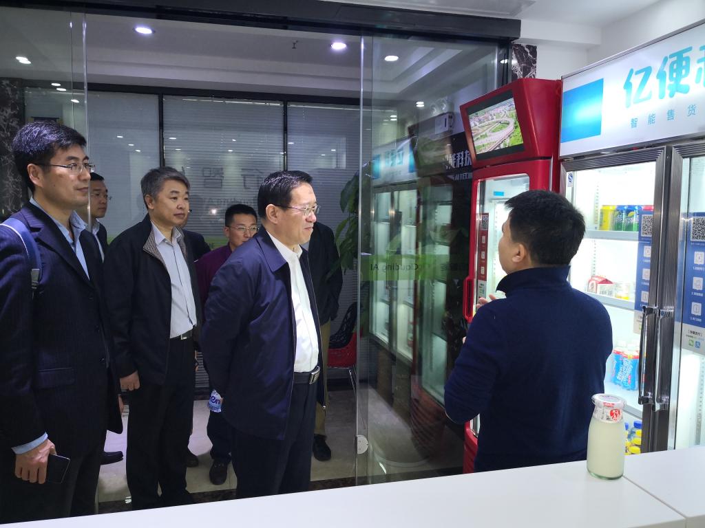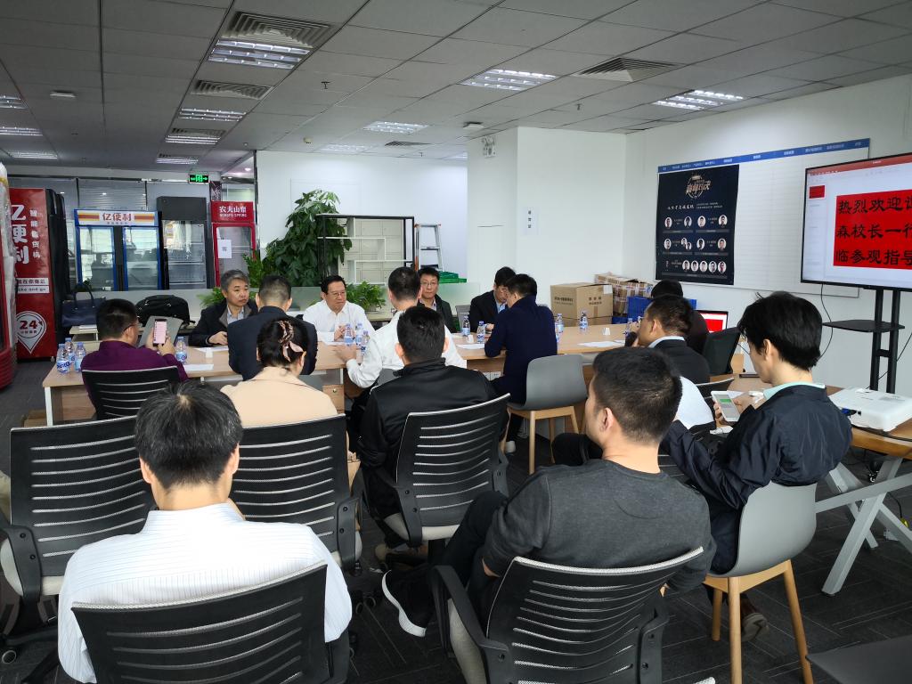 随后,谭秀森一行调研了校友创业企业——深圳云行科技有限公司。公司联合创始人、机械2000级校友吴晓波介绍了企业在AI人工智能研究、工程实施,商业实践,尤其新零售方面的探索和取得的一些成绩,表达了与母校联合建立人工智能实验室、支持母校事业发展的想法。