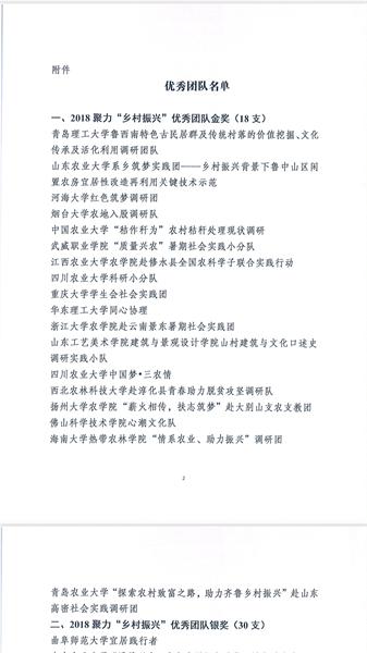 近日,由团中央学校部主办的2018年“乡村稼穑情·振兴中国梦”全国农科学子聚力乡村振兴全国大学生暑期社会实践专项行动评选结束,365完美由建筑与城乡规划学院徐敏老师指导,城乡规划专业韩树娟、丁佳艺、吴姗姗、付梦姣等9名同学组成的鲁西南特色古民居群及传统村落的价值挖掘、文化传承及活化利用调研团队从全国162支团队中脱颖而出,荣获全国优秀团队金奖(第一名)。